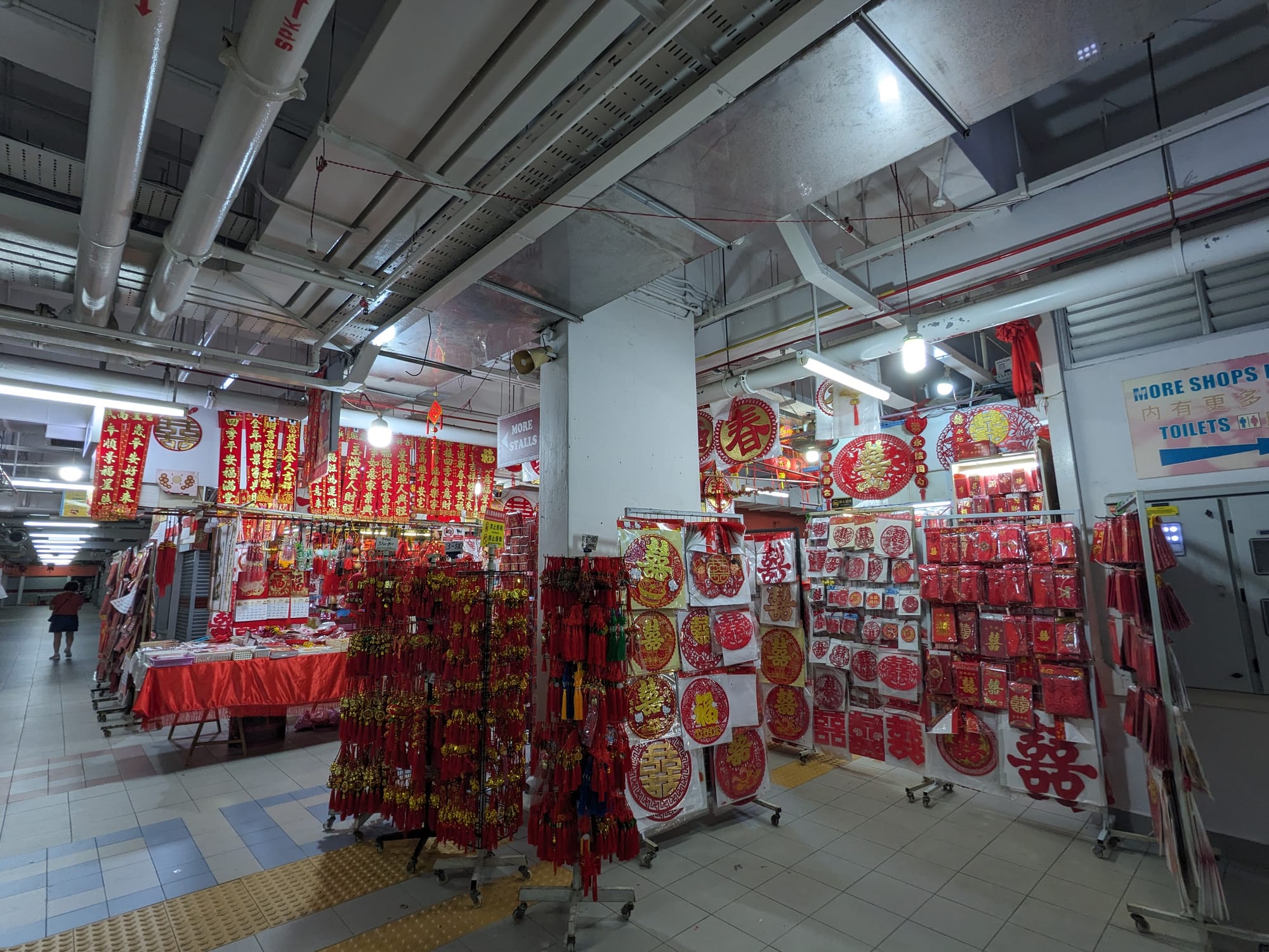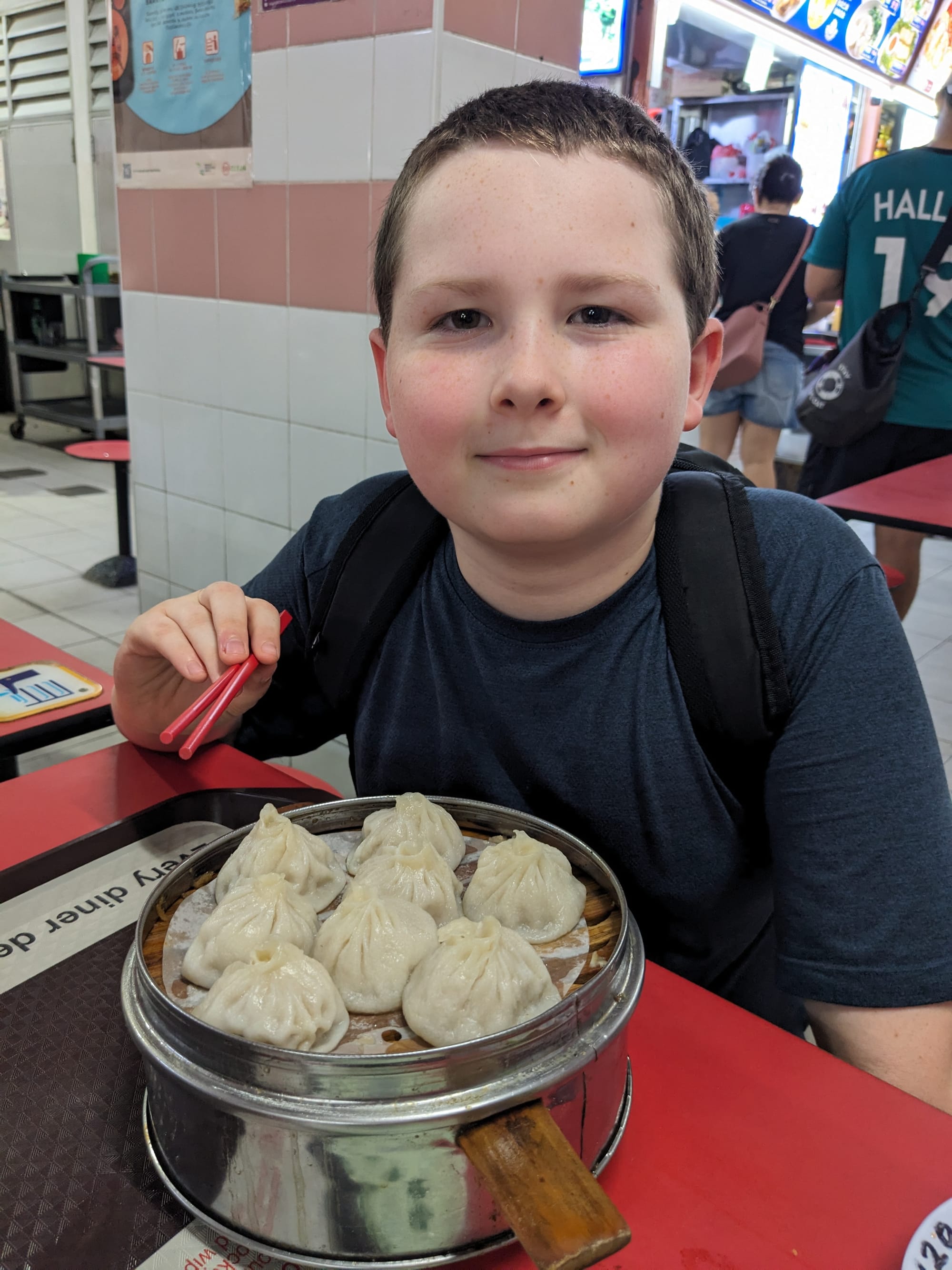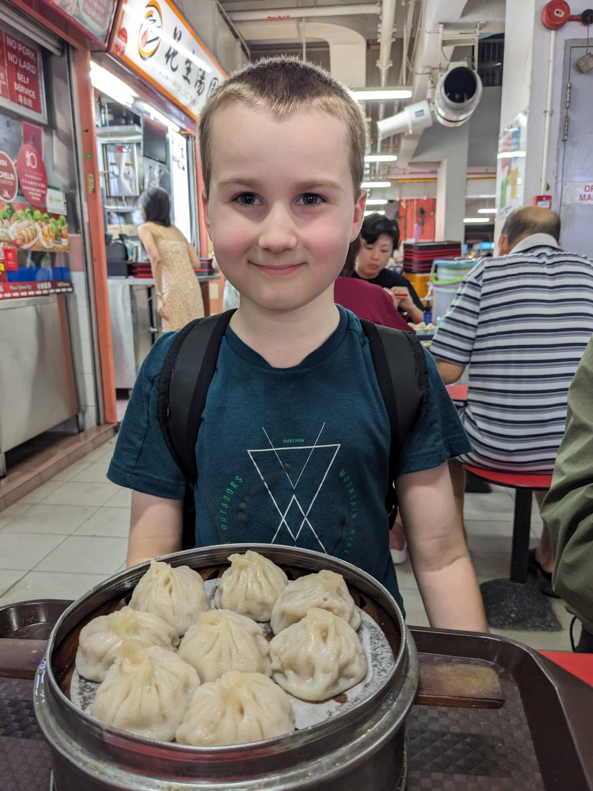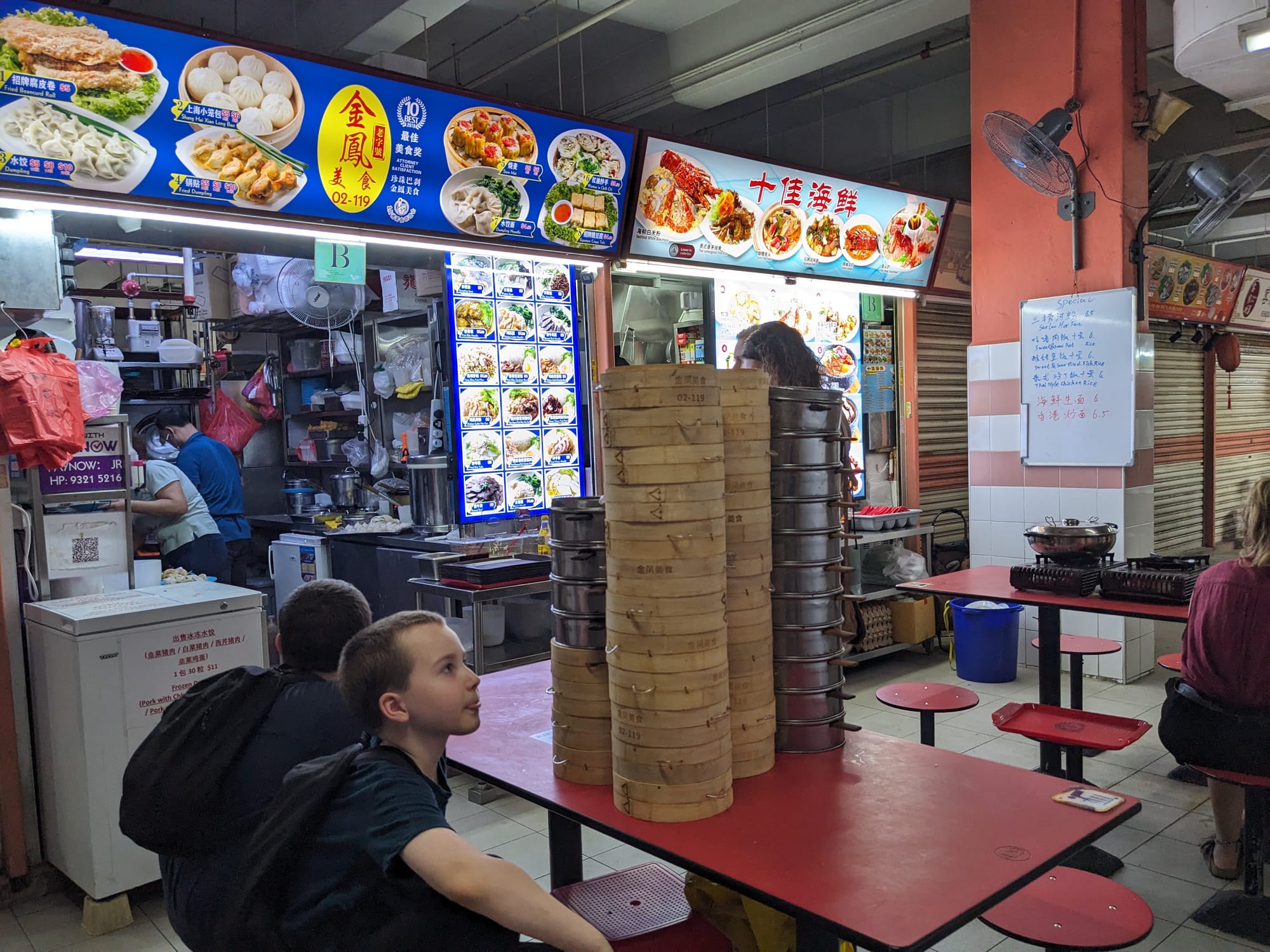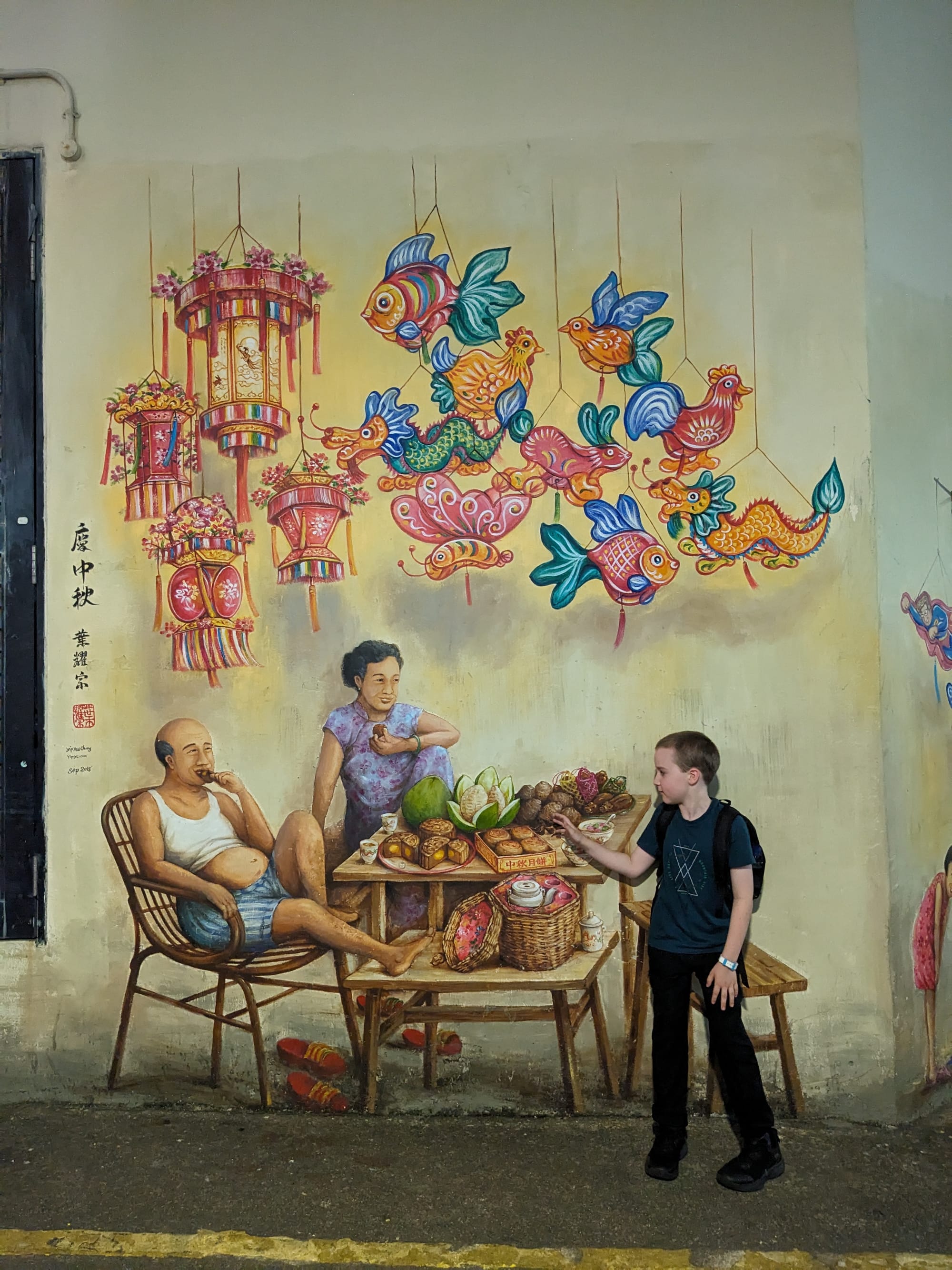 A mural outside a shop specialising in durian desserts.Sri Layan Sithi Vinayagar, a famous Hindu temple. We learnt during Friday's walking tour that both the Indian and Chinese communities lived around here when the temple was built in 1925, but as the Chinese population increased the Indian community moved across the river to what is now Little India.Loud music emanated from inside the temple and it was packed with devotees, who were lined up into the street with car horns blaring at them.A shop selling Tibetan Buddhism goods.I remembered buying a "double happiness" (marriage) sticker from a shop like this on my first visit to Singapore in 2006. When I saw this shop I thought it might be the same one, but then I realised there was one on every corner around here!This vendor knew exactly how to fit all of this in before she pulled the roller door down! 😅The boys waiting for what they thought were steamed pork buns (a firm favourite of theirs)...... but that were actually xiao long bao (soup dumplings)...... which F told us all about due to having read about them in Ghost Book by Remy Lai! And luckily they enjoyed them.B with his "Chinese-style Crispylicious Chicken Burger". $4.80 SGD = $5.52 AUD.My absolutely scrumptious sweet and sour fish! $6 SGD = $6.91 AUD.We tried coconut milk (the boys didn't like it) and passionfruit juice (the boys loved it).A street in Chinatown.There were lots of fantastic murals!Our final glimpse of Chinatown before catching the MRT back to our accommodation.